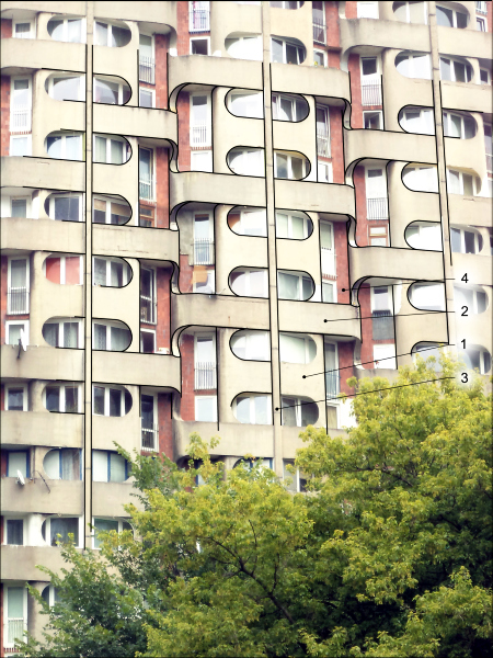 Zespół budynków mieszkalnych przy pl. Grunwaldzkim we Wrocławiu, wybudowany w latach 1967 – 75. Mimo ograniczeń wynikających z czasów, w których były wznoszone widoczne są tu wszystkie możliwości kształtowania elementów betonowych.