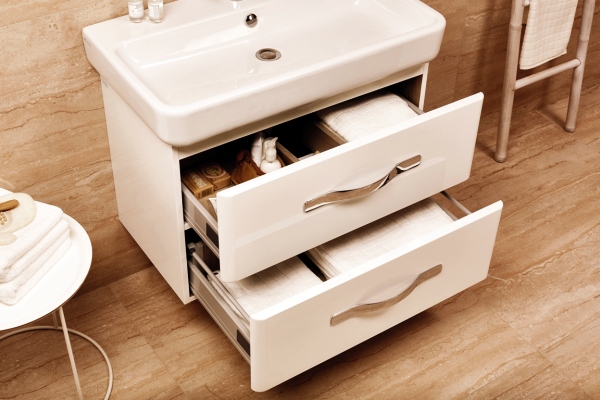 Szafki, dzięki zaokrąglonym bokom, tworzą z ceramiką spójną całość. Podkreślają biel umywalek, jeszcze bardziej rozjaśniając wnętrze. Umywalki i szafki podumywalkowe są dostępne w szerokości 60 cm, 70 cm i 80 cm. Sprawdzą się więc zarówno w małej łazience, jak i większym salonie kąpielowym.